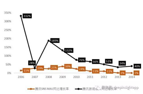 可以看到,騰訊SNS的MAU一直保持著一個較為穩(wěn)定的增長率,而游戲收入增長率的波動相對較大,兩組數(shù)據(jù)并沒有出現(xiàn)很強的正相關。