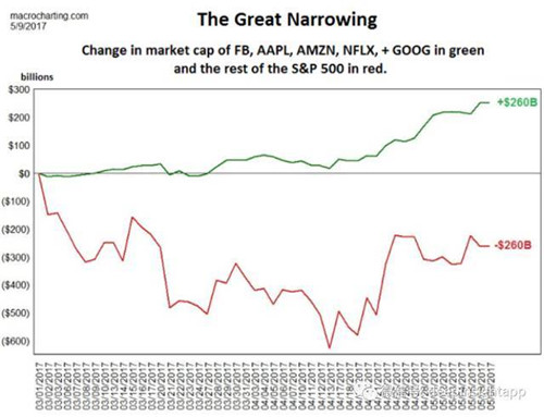 在美國(guó)同樣的事情也在發(fā)生:蘋(píng)果,微軟,亞馬遜,F(xiàn)acebook和谷歌這五只股票的漲幅占到今年標(biāo)普500的13%,以及納斯達(dá)克100的42%。下面這張圖非常有趣:從今年3月1日到5月9日,美國(guó)科技股的這五大天王市值增長(zhǎng)了2600億美元,而其他標(biāo)普500的公司市值縮小了2600億美元。