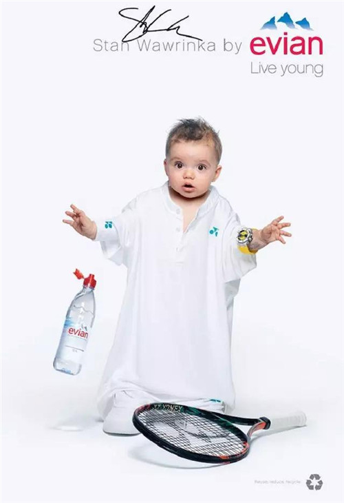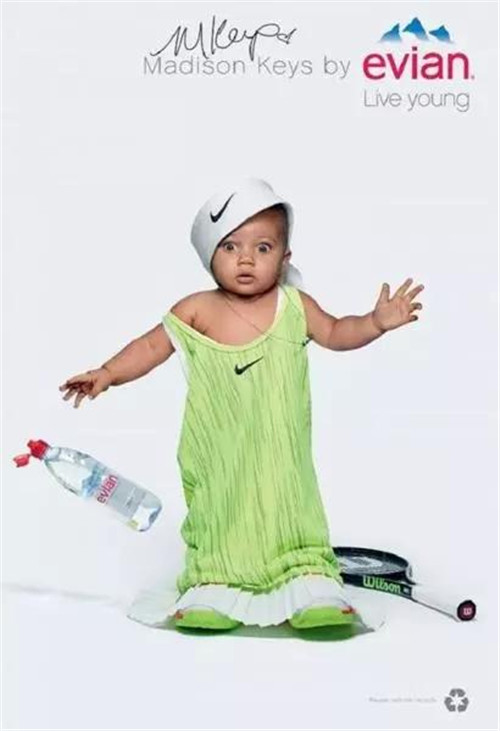 針對戶外、數(shù)字和社交網(wǎng)絡(luò)的創(chuàng)意則主要集中在一個 Evian Young Team 的概念,一個由依云代言人莎拉波娃、Stan Wawrinka、Lucas Pouille、Madison Keys 以及高爾夫球員 Lydia Ko 等人組成的團隊來拍攝廣告的主要視覺:喝了依云水之后,他們都換上一套 Oversize 的運動服,“變成了嬰兒”。