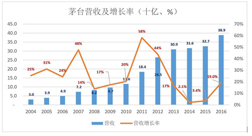2004-2016年,茅臺(tái)營(yíng)收平均年復(fù)合增長(zhǎng)率為26.1%。這12年大致可分為兩段: