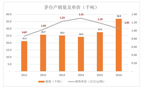 茅臺(tái)先后上馬“十一五”和“十二五”兩個(gè)萬噸茅臺(tái)酒工程。2011年,茅臺(tái)酒及系列酒基酒產(chǎn)量接近4萬噸:2016年達(dá)6萬噸(其中茅臺(tái)酒基酒為3.93萬噸);2016年產(chǎn)量為2005年產(chǎn)量的376%,年均復(fù)合增長(zhǎng)率12.8%。