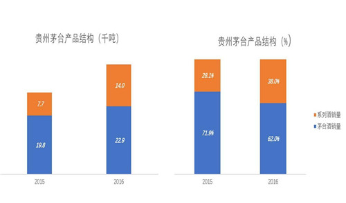 貴州茅臺(tái)將產(chǎn)品分為兩大類:茅臺(tái)酒、其他系列酒(茅臺(tái)王子酒、茅臺(tái)迎賓酒、賴茅酒等)。2016年,兩類產(chǎn)品銷量分別為2.3萬噸和1.4萬噸,同比增幅分別為15.76%和81.69%。#5700多億市值由2.3萬噸茅臺(tái)酒撐起#