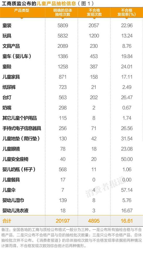 抽檢數(shù)據(jù)顯示,兒童產(chǎn)品的質(zhì)量情況不容樂觀,整體不合格發(fā)現(xiàn)率高達(dá)16.6%。童裝、玩具、文具用品、童車等一直是質(zhì)監(jiān)抽查部門重點(diǎn)監(jiān)管的對(duì)象,而童裝、童鞋、臺(tái)燈、手持式電子信息器具(如學(xué)習(xí)機(jī)、早教機(jī)等)、兒童爬行墊等類型產(chǎn)品的不合格發(fā)現(xiàn)率均超過20%。整體而言,兒童產(chǎn)品在標(biāo)識(shí)、危險(xiǎn)尖端與零件上存在更多的問題。