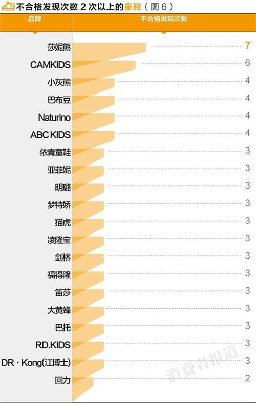 抽檢數(shù)據(jù)顯示,上海童鞋品牌莎妮熊的的不合格次數(shù)最高,而童鞋抽檢不合格的,回力也有兩次出現(xiàn)不合格。主要問題集中在強(qiáng)度硬度、標(biāo)識(shí)、感官質(zhì)量、高度(長度)誤差等方面。