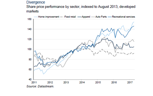零售商大批破產(chǎn)的同時,一些對電商“免疫”的行業(yè),在過去幾年表現(xiàn)卻明顯優(yōu)于其他消費(fèi)類行業(yè)。高盛在一篇報告中總結(jié)了以下四類:1、線下體驗型消費(fèi)(如游樂場);2、“大件”商品和服務(wù)(如家具、教育);3、B2B類商品(如工業(yè)零件);4、有監(jiān)管約束的商品(如藥品)。