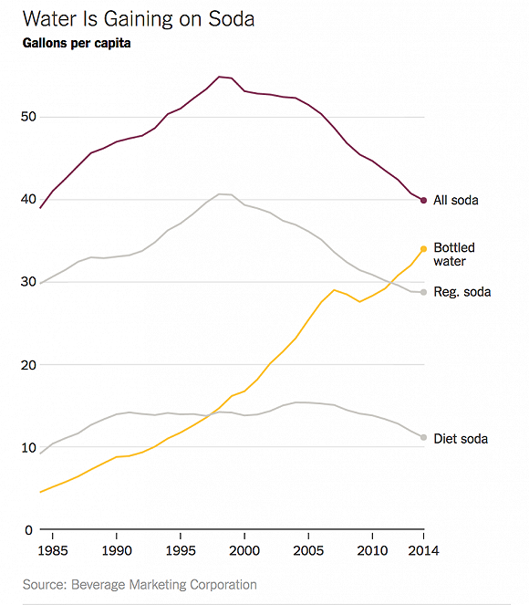 1960年代到1990年代,汽水公司經(jīng)歷過銷售量猛漲。而過去二十年里,汽水在美國(guó)的銷量暴跌了將近25%。而行業(yè)調(diào)研機(jī)構(gòu)Beverage Digest最新數(shù)據(jù)顯示,美國(guó)汽水2016年的銷量滑入了近31年來的最低谷,較去年銷量又降低了0.8%。
