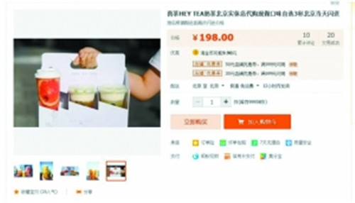 “炎熱的夏季,喜茶?排隊(duì)?我們可以免去你所有不必要的麻煩,你只需要坐在家里等著喝就好了!喜茶代購(gòu)!”、“喜茶HEY TEA奶茶北京實(shí)體店代購(gòu),現(xiàn)做,口味自選3杯,北京當(dāng)天閃送”……此類喜茶代購(gòu)宣傳語(yǔ)在貼吧、微博、淘寶等各種網(wǎng)絡(luò)空間上不難找到,排長(zhǎng)隊(duì)的喜茶總是伴隨著黃牛代購(gòu)。