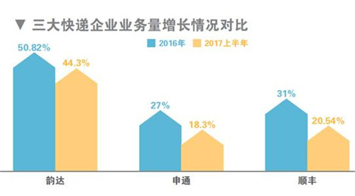 根據(jù)順豐發(fā)布的財報顯示,2017年上半年,順豐控股實現(xiàn)快件業(yè)務(wù)量13.73億件,同比增長20.54%;2016年順豐快件業(yè)務(wù)量為25.8億件,同比增長31%。而申通快遞2017年半年業(yè)務(wù)量為17.26億件,同比增長18.3%;2016年業(yè)務(wù)量近32.6億件,同比增長約27%。此外,韻達2017年上半年財報數(shù)據(jù)也顯示,業(yè)務(wù)量同比增長44.28%;相比2016年公司業(yè)務(wù)量50.82%的增幅有所減緩。