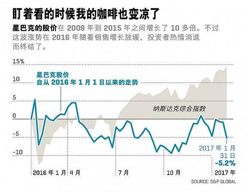就連舒爾茨本人也說,星巴克的股票走勢有些不穩(wěn)。從2009年起到2015年,公司的股價增長了1,170%,而在2016年則跌去了8%,這是自從2008年以來的首次下跌—盡管大盤上漲了10%。令人沮喪的是,下跌竟然找不到很明確的原因。有些懷疑指向了銷售增長放緩、舒爾茨(第二次)宣布從首席執(zhí)行官的位置上退休后領(lǐng)導層的不確定性、甚或是這家總部位于西雅圖的公司制定了依靠海外市場的發(fā)展計劃,而特朗普執(zhí)政后給跨國經(jīng)營帶來了不確定因素。