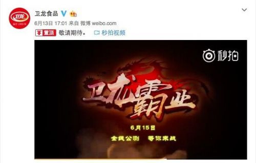 6月14日消息,衛(wèi)龍辣條也要跨界出手游了。衛(wèi)龍食品官微曝光了一則預(yù)告短片,表示將于6月15日公測一款名叫《衛(wèi)龍霸業(yè)》的手游。