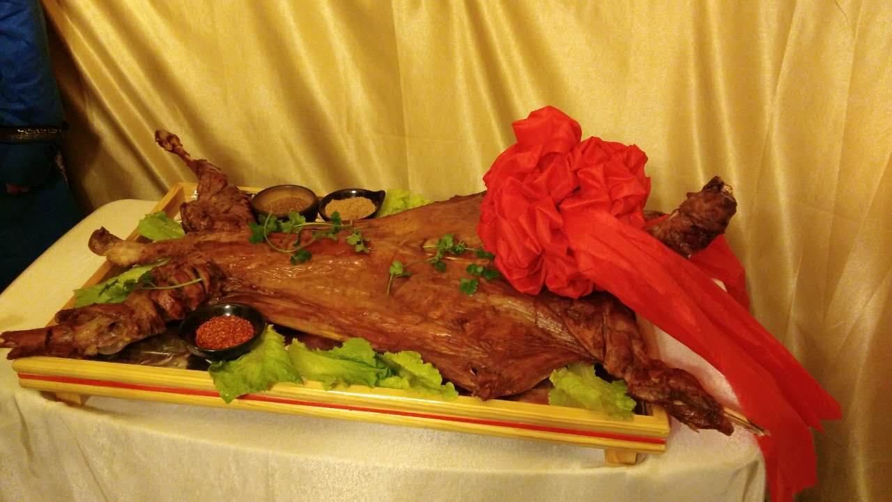 只一道烤全羊,酒店大廚都頗費(fèi)工夫。食材精選肉質(zhì)鮮嫩的鮮羊,肉質(zhì)均勻。因?yàn)閷?duì)“原汁原味”的極致追求,整只羊需提前三個(gè)小時(shí)炭火慢慢烤制??救蛏舷?,色澤金黃,表皮脆嫩,鮮香襲人,令人垂涎欲滴。此時(shí),酒店工作人員會(huì)為當(dāng)晚最尊貴的客人獻(xiàn)上哈達(dá),并邀請(qǐng)客人一起舉行“開(kāi)羊儀式”,在蒙古,這象征主人對(duì)朋友最誠(chéng)摯的祝福。