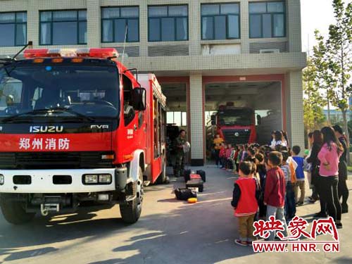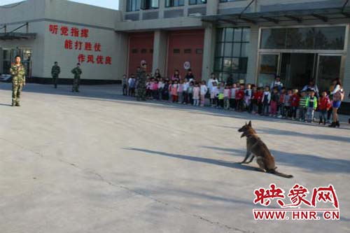 在老師和消防隊員的帶領(lǐng)下,孩子們有秩序地參觀。首先參觀了一樓車庫,孩子們被消防車以及車上的先進裝備深深吸引,消防員叔叔耐心細致地為孩子們講解消防車上的小秘密:高壓水槍、防毒面罩、氧氣瓶、急救箱、云梯、泡沫噴射槍、定位器、呼救器等消防裝備,使孩子們開了眼界。消防隊員還用淺顯的語言向孩子們介紹了消防常識:火災的危害、火災的預防、火災發(fā)生時的逃生自救、消防器械的使用、消防服的穿戴等等。接著孩子們參觀了二樓的消防員宿舍、圖書室、會議室、體育活動室等,更深入地了解了消防員的學習生活,更加走近消防員。最后,消防員為孩子們帶來了精彩的警犬搜救表演,孩子們興高采烈,不約而同為消防員叔叔鼓掌叫好!