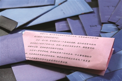 而最棘手則是一些父母與孩子之間有一些矛盾,“我們班一個(gè)男生因?yàn)楦咧袝r(shí)候爸媽管他管得太緊,以至于跟他們之間產(chǎn)生了很大的矛盾,他的父母知道有這樣一個(gè)可以給孩子寫(xiě)信的機(jī)會(huì)之后,雖然很高興,但是也憂心忡忡,害怕孩子不愿意看他們的信,或者會(huì)因?yàn)檫@封信措辭不合適而加深對(duì)他們的誤解。我開(kāi)導(dǎo)了他們很久,他們才愿意寫(xiě)一封信,希望可以解開(kāi)這個(gè)心結(jié)。”陳老師表示,這位同學(xué)的父母寫(xiě)的信更像是一封和解信,在字里行間的深深愧疚中,她也感受到了家長(zhǎng)對(duì)于孩子的無(wú)奈和那一顆期望孩子快樂(lè)的心。