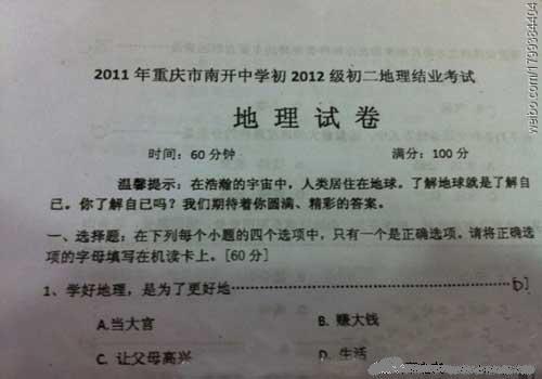 有在試卷上創(chuàng)意答題,讓人爆笑的學生,更有云天霧罩,不著邊際出題的老師。真不知道出題是這些老師是怎么想的。