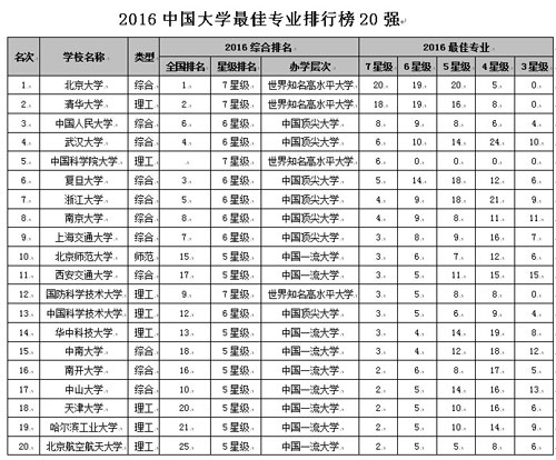 報告顯示,北京大學(xué)20個專業(yè)榮膺中國七星級專業(yè),居2016中國大學(xué)最佳專業(yè)排行榜榜首;清華大學(xué)第2,中國人民大學(xué)第3,武漢大學(xué)第4,中國科學(xué)院大學(xué)第5。