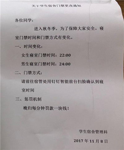 近日,有杭州某高校學(xué)生爆料,杭州某大學(xué)宿舍管理處為管理學(xué)生寢室門(mén)禁,引入人臉識(shí)別簽到,要求女生在晚上10點(diǎn)前回宿舍,晚到一分鐘罰款1塊錢(qián),而男生竟然可以晚兩小時(shí)。