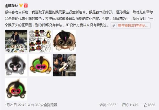 春晚吉祥物康康由“福娃”的創(chuàng)作者之一韓美林設(shè)計(jì),官方稱(chēng)是以中國(guó)傳統(tǒng)水墨畫(huà)的藝術(shù)形式,生動(dòng)表現(xiàn)出“猴”的機(jī)靈活潑特點(diǎn)??纯错n老師的手稿,也是能get到喜慶的氛圍和毛茸茸的手感,還算是只討人喜愛(ài)的猴子↓