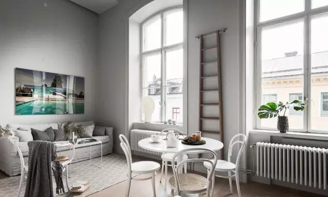 客廳以灰白色為主,大面積的玻璃窗戶讓室內(nèi)顯得格外明亮通透,沙發(fā)在色調(diào)與圖案上做了變化,豐富了空間層次。墻上的一幅藝術(shù)品在視覺(jué)上給空間升溫,打破過(guò)于沉浸和單調(diào)的感覺(jué)。由于整個(gè)空間格外高挑,墻上懸掛的梯子不僅起了裝飾作用,也是日常必備工具。