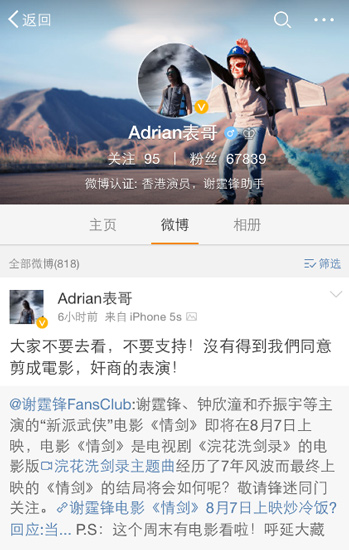 那么,《情劍》的兩位“主演”謝霆鋒與鐘欣桐為什么沒來宣傳本片呢?馬云對此表示:“兩位演員都還有別的戲要拍,沒時間來宣傳我們的電影。”但前幾日港媒問及了兩人的經(jīng)紀人霍汶希,對方稱《情劍》片方根本沒有通知他們上映的事,更沒有邀請二人宣傳。而在微博上認證為“香港演員、謝霆鋒助手”的網(wǎng)友“Adrian表哥”也發(fā)微博指責(zé)片方并沒有得到謝霆鋒的同意,是奸商行為。另外,記者也查閱了《情劍》的官方微博,該官微在開辦至今僅發(fā)7條微博,有90個粉絲??梢哉f,《情劍》除了一組有“抄襲嫌疑”的海報之外幾乎是在沒有任何宣傳的情況下推進院線的。