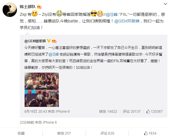 近日,一張章子怡發(fā)布會挺著“大肚”的照片引發(fā)網(wǎng)友熱議,雖然只是假扮孕婦,卻引來大波網(wǎng)友詢問何時(shí)準(zhǔn)備要寶寶,可見網(wǎng)友對兩人感情生活的關(guān)注。8月16日,鄧紫棋在微博上曬出汪峰為其過生日的照片,17日中午,汪峰轉(zhuǎn)發(fā)此微博并稱要為學(xué)員們加油,17日下午,章子怡回復(fù)汪峰:“Ziqi有~Ziyi沒有,等著回家跪榴蓮?!?/font>