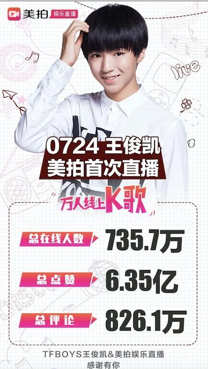 “大哥”王俊凱作為TFBOYS的隊長及團隊核心,一直備受90后乃至00后粉絲追捧。7月24日下午5點王俊凱開啟了在美拍的個人直播首秀,與“小螃蟹”們進行了長達五十分鐘“嗨歌模式”。直播開始正式開始后,觀眾突破六百萬,點贊數(shù)超過五億,而總評論數(shù)更是達到了驚人的826萬,毫無疑問成為全網互動數(shù)最高的直播,同時更輕松登上微博微博熱門話題榜單,收獲1.5億閱讀量。