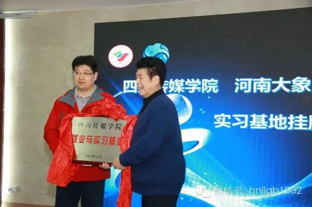 四川傳媒學(xué)院副院長(zhǎng)王雷、河南大象融媒體集團(tuán)副總裁李強(qiáng)為“四川傳媒學(xué)院·大象融媒就業(yè)實(shí)習(xí)基地”掛牌。