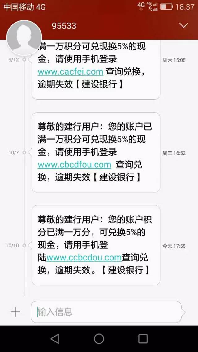 9月24日,受害人尹某,收到來自95533兌換建行賬戶積分的詐騙短信,點擊釣魚網站鏈接操作后被轉賬騙走5000元。9月28日,受害人盧某,收到95533兌換建行積分詐騙短信,點擊釣魚網站鏈接操作后被轉賬騙走3900元。