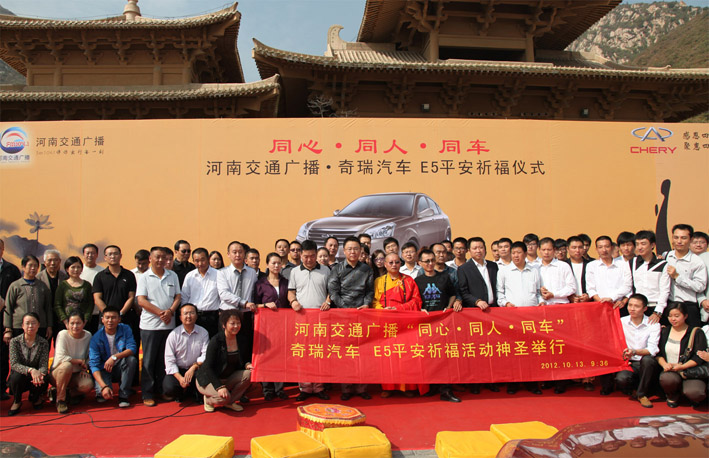 公元2012年10月13日(農(nóng)歷八月二十八)9:36正點時刻,河南交通廣播“同心?同人?同車—奇瑞汽車 E5平安”祈?;顒由袷ヅe行。河南交通廣播為了讓本次祈?;顒託夥崭?,在更大范圍內(nèi)傳播、弘揚禪宗之精神。特把本次活動的主要儀式設(shè)置禪文化氛圍濃郁的“禪宗少林·音樂大典”內(nèi)神圣舉行。