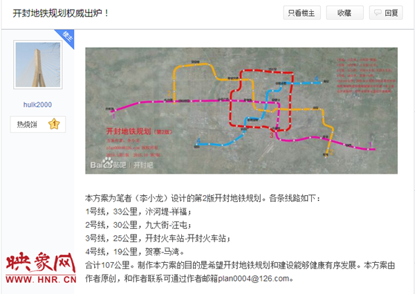 【傳聞】11月初,網(wǎng)絡(luò)上謠傳“開封要修建地鐵,市區(qū)內(nèi)規(guī)劃了4條線路”不少開封市民在網(wǎng)上看到一則關(guān)于開封要修建地鐵的消息,引來一片熱議,同時市民在論壇上也有發(fā)帖熱議。