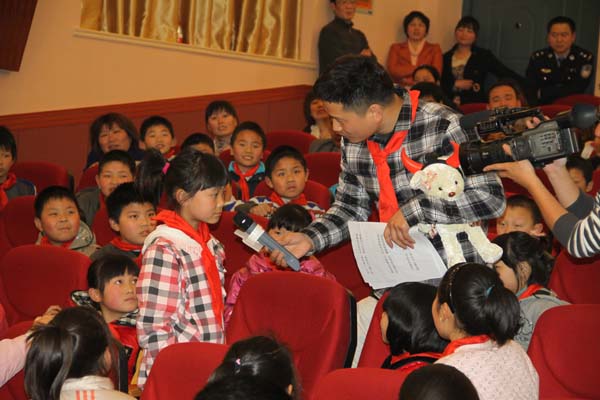 活動(dòng)現(xiàn)場信息廣播主持人張東為答對問題的小學(xué)生派送禮物
