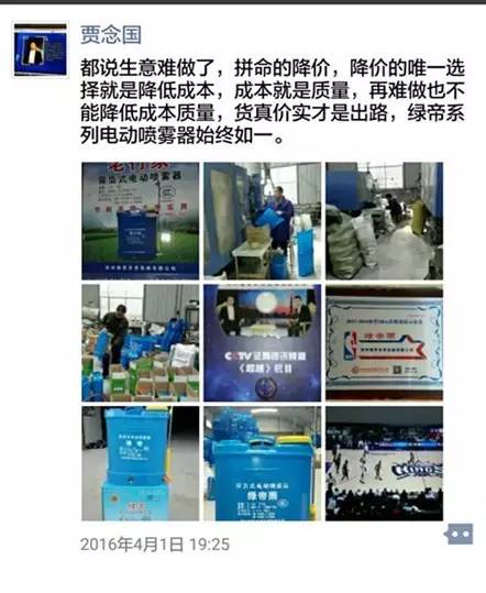 任何一名企業(yè)家,都有困惑的時(shí)候。開始的時(shí)候,生產(chǎn)電動(dòng)噴霧器的公司也就只有他這一家,如今在河南省內(nèi)達(dá)到了100多家,全國(guó)的生產(chǎn)廠家有1000多家,賈總覺得目前市場(chǎng)競(jìng)爭(zhēng)是比較激烈的,仿造的甚至是假冒的產(chǎn)品還時(shí)有出現(xiàn);產(chǎn)品的利潤(rùn)也沒有以前高了;隨著原材料及工人工資等成本的增加,批發(fā)價(jià)格也有所調(diào)高;這一點(diǎn),有時(shí)在賈總的微信里也看出了一些無奈和感慨?! ?/p>