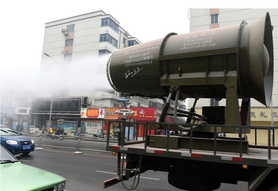 鄭州街頭現“防霾神器”霧炮車,據悉其噴射的水霧顆粒達到微米級,能有效分解空氣中的污染顆粒物、塵埃等,有效緩解霧霾。2015年01月05日,河南省鄭州市經三路上出現一輛大卡車,車上拉著一個大炮筒。工作人員說,這是一輛多功能抑塵車,俗稱“霧炮車”。“這輛車能裝10噸水,供霧炮噴射75分鐘?!惫こ處煆垏鴱娬f,霧炮車噴射的水霧顆粒達到微米級,能有效分解空氣中的污染顆粒物、塵埃等,有效緩解霧霾。