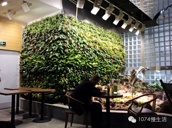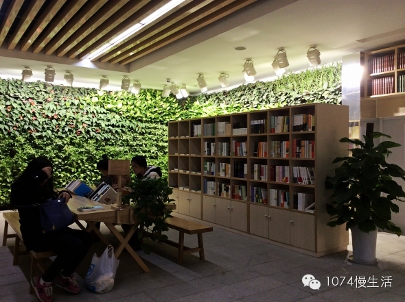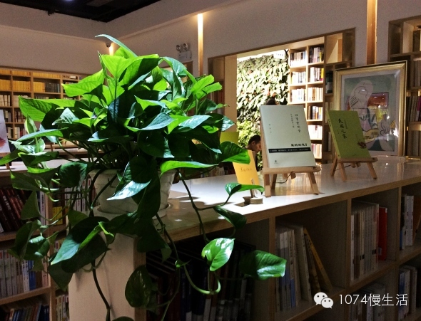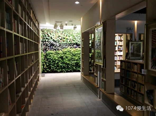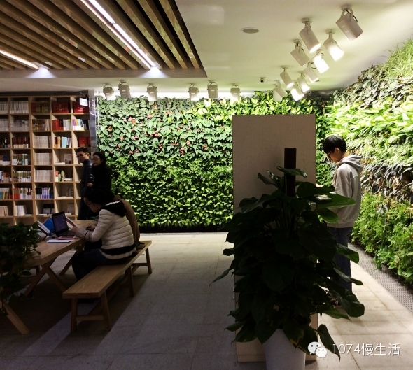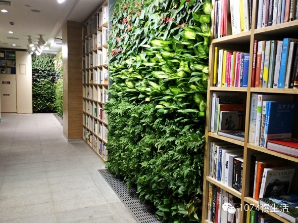 書架間隙,大片的綠色植被,墻上全都是鮮活的植物,目之所及,除了書,就是綠色。
