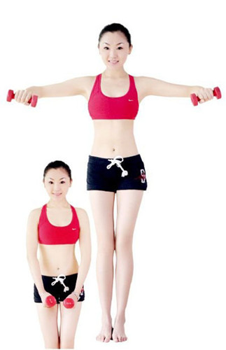 動作要領:雙手握啞鈴放于身體前,膝蓋微微彎曲。手臂慢慢向兩側抬起呈半圓形,大臂盡量向后靠,注意腕關節(jié)要低于肘關節(jié),肘關節(jié)要低于肩關節(jié)。返回至初始位置,重復20~30次,每回至少做4組,每組之間要有間隙。