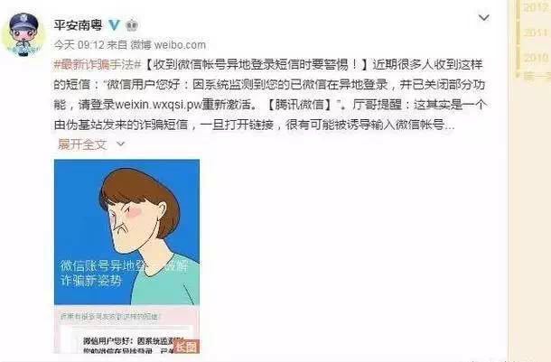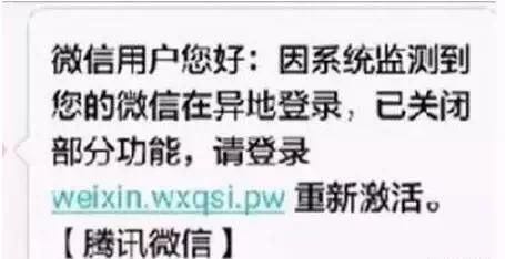 #最新詐騙手法#【收到微信帳號異地登錄短信時(shí)要警惕!】近期很多人收到這樣的短信:“微信用戶您好:因系統(tǒng)監(jiān)測到您的已微信在異地登錄,并已關(guān)閉部分功能,請登錄weixin.wxqsi.pw重新激活。【騰訊微信】”。廳哥提醒:這其實(shí)是一個(gè)由偽基站發(fā)來的詐騙短信,一旦打開鏈接,很有可能被誘導(dǎo)輸入微信帳號、微信密碼、支付密碼、驗(yàn)證碼等,后果不堪設(shè)想……