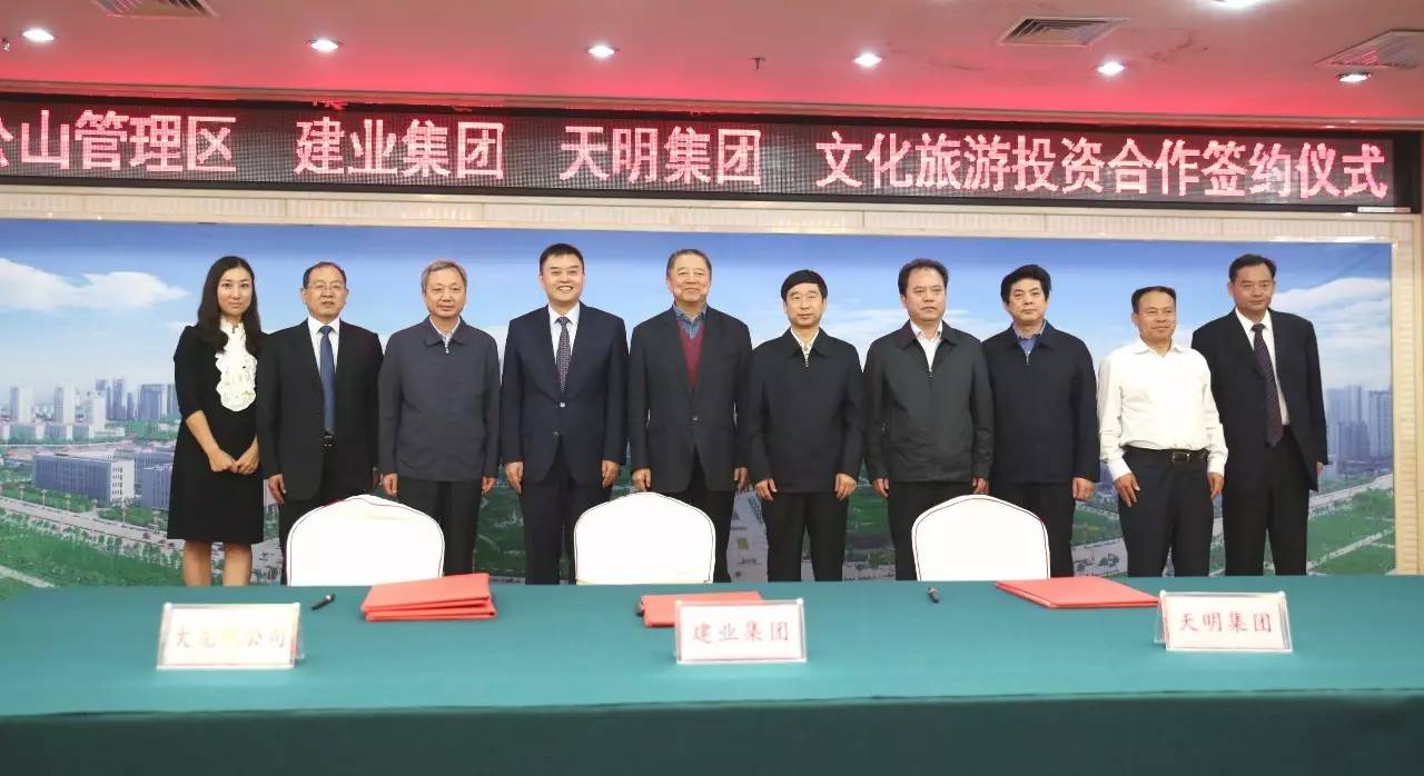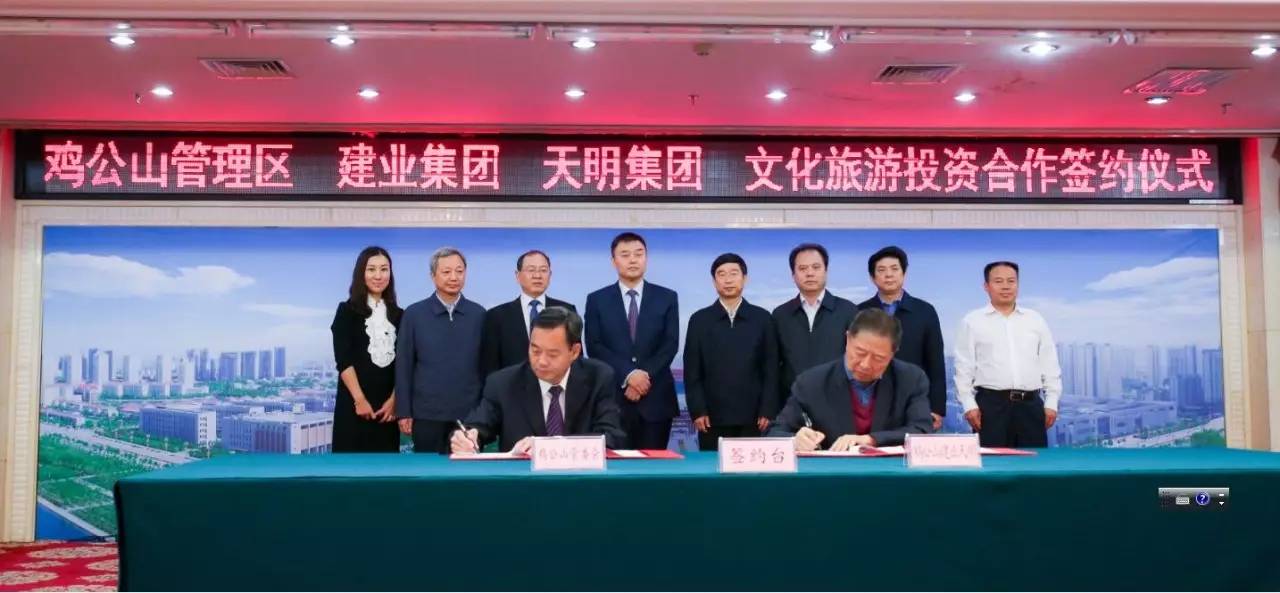 2017年9月2日上午,雞公山管理區(qū)與建業(yè)集團(tuán)、天明集團(tuán)在信陽(yáng)市舉行文化旅游投資會(huì)暨簽約儀式。此次簽約項(xiàng)目總面積287平方公里,初步構(gòu)思“一園十三景”,計(jì)劃總投資300~500億元。未來(lái),兩家企業(yè)將攜手打造文化旅游項(xiàng)目,助力信陽(yáng)雞公山脫貧攻堅(jiān)、建設(shè)美麗鄉(xiāng)村。信陽(yáng)市市委書(shū)記喬新江、市長(zhǎng)尚朝陽(yáng)、建業(yè)集團(tuán)董事長(zhǎng)胡葆森、建業(yè)集團(tuán)聯(lián)席董事長(zhǎng)劉衛(wèi)星、建業(yè)集團(tuán)副總裁陳劍、天明集團(tuán)董事長(zhǎng)姜明、天明城建集團(tuán)總裁郭穎、雞公山管委會(huì)黨委書(shū)記、主任趙安虎等領(lǐng)導(dǎo)出席簽約儀式。