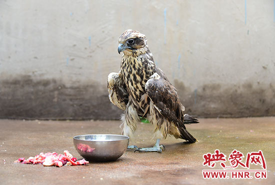 “這是一只獵隼,在我國屬于國家二級重點保護(hù)動物。蒙古國政府在2012年決定,將獵隼確定為蒙古國“國鳥”。蒙古國官方數(shù)據(jù)顯示,蒙古國境內(nèi)現(xiàn)存獵隼約6800只。由于它分布在蒙古國和我國的新疆、甘肅以及內(nèi)蒙古等地,而在我們河南沒有分布,因此十分罕見。從它頭頂色絨毛還沒退去就可以看出,它是今年剛孵化出來兩個多月的幼鳥。它的右翅膀第四、第五根飛羽有斷裂,右爪輕微擦傷,另外它患有非常嚴(yán)重的腸炎。這只獵隼,應(yīng)該是被人非法飼養(yǎng)后逃逸出來的,由于其野外捕食能力差,饑腸轆轆,體力不支,飛不起來,后被好心村民發(fā)現(xiàn),要不然是不可能逮住的。也多謝這位好心村民,要不然,它極易受到野狗野貓和其他大型猛禽襲擊或者落入不法分子手中牟取暴利。”董站長說。