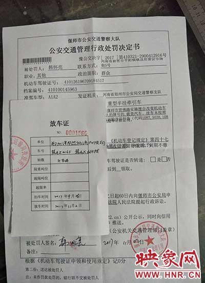 11月2日下午16時許,偃師市交警大隊給韓先生開具了公安交通管理行政處罰決定書【2017】410321-2900412916號,處罰900元。韓先生急匆匆去交了900元罰款后,拿了交警隊的交款單去了交通局,交通局于當天晚上17時30分許,給韓開具放車單。韓去停車場看到自己的車時,已經是當天晚上20時以后了。