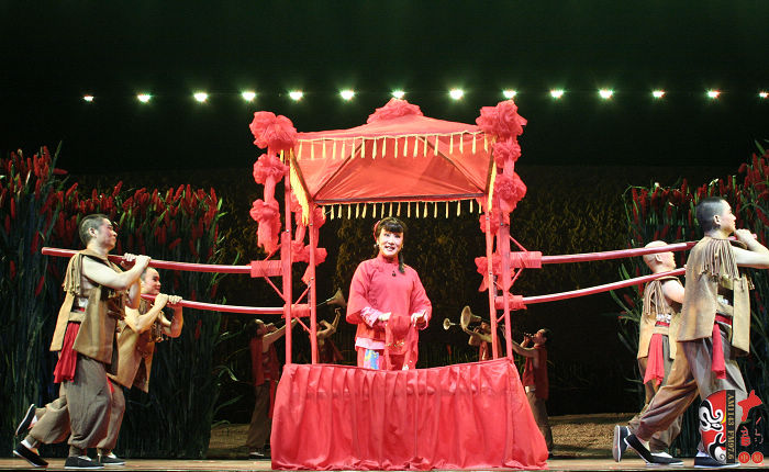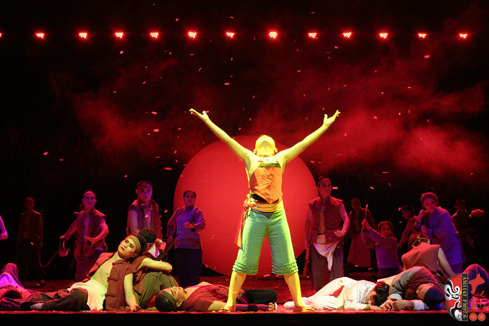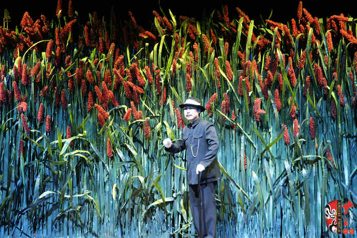 本劇以蓬蓬勃勃、充滿野性、有著旺盛生命力的紅高粱為意像,以九兒和十八刀的愛恨情仇為主線,描繪了上個世紀(jì)三、四十年代,先民們敢愛、敢恨、敢生、敢死的自由精神與生命氣度以及他們對入侵者不惜用鮮血和生命抗?fàn)?、可歌可泣而又悲壯慘烈的過程。最后九兒用高粱酒做炸藥,引爆了日本人的軍火車,軍火車的爆炸又扎爆了熟透了的高粱米,滿天都飄灑著絢麗的高粱花——這是他們的鮮血之花、靈魂之葩,更是他們精神的升華。