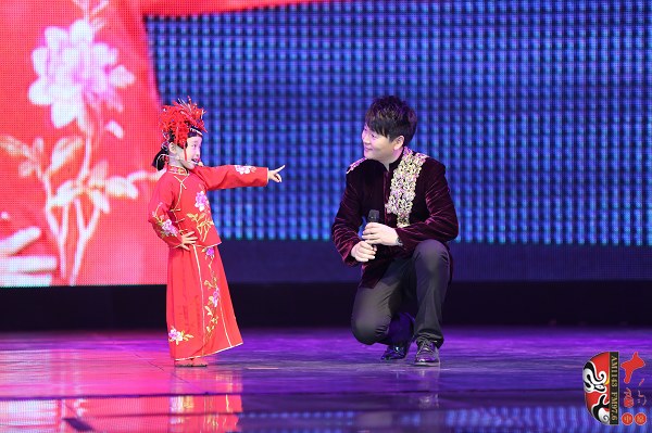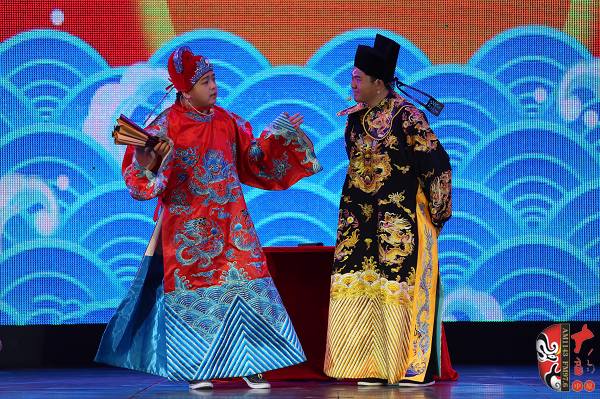 第十屆河南省少兒戲曲小梅花大賽“小狀元”、《梨園春》明星小擂主張楚怡(左)聯(lián)合表演《花打朝》選段