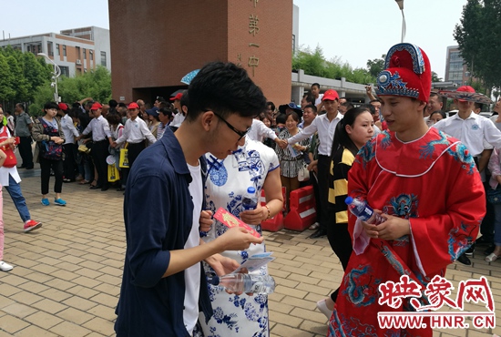 除了特殊的公交助考服務車,公交一公司1路車長郭磊穿著狀元服為參加高考的考生送去“紅包”,讓不少考生頗感意外。而且引來了不少家長和考生的競相合影。