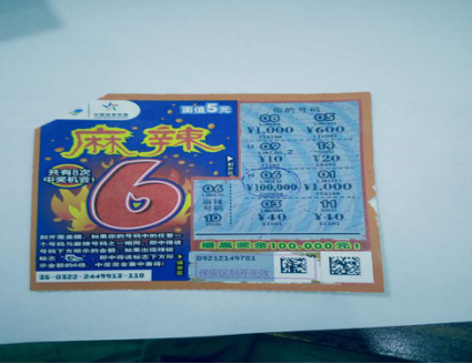 “麻辣6”玩法簡單。刮開覆蓋膜,如果你的號(hào)碼中的任意一個(gè)號(hào)碼與中獎(jiǎng)號(hào)碼之一相同,即中得該號(hào)碼下方所示的金額;如果出現(xiàn)辣椒標(biāo)志,即中得該標(biāo)志下方所示金額的6倍。獎(jiǎng)金兼中兼得。(李棟)