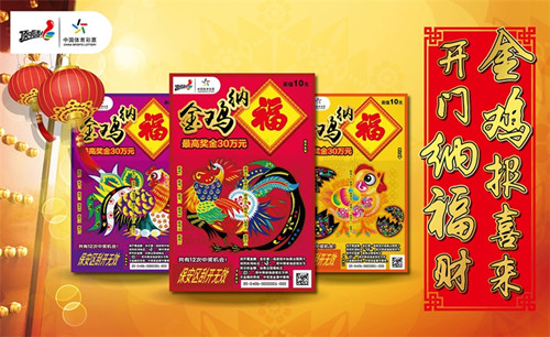 每逢歲末年初,頂呱刮都會推出賀歲票,今年也不例外,雞年賀歲票“金雞納?!碧崆芭c彩民們見面了。該票有紅、紫、黃三款,以寓意吉祥如意的錦雞為主題,絢麗的色彩中透露出濃濃的中國風(fēng)。單張面值10元,有12次中獎機會,最高獎金30萬元,游戲形式為:刮開覆蓋膜,在任意一場游戲中如果出現(xiàn)兩個相同的“雞”標志,即中得該場游戲右方所示的金額;如果出現(xiàn)“福”標志,即中得該場游戲右方所示金額的兩倍。