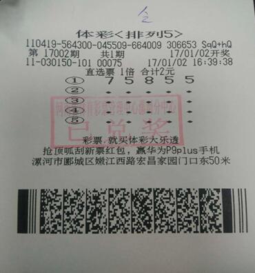 1月2日晚,第17002期排列五開(kāi)獎(jiǎng),開(kāi)獎(jiǎng)號(hào)碼是“75855”,漯河彩民喜中10萬(wàn)元大獎(jiǎng)1注,這也是當(dāng)?shù)?017年第1注排列五大獎(jiǎng)。