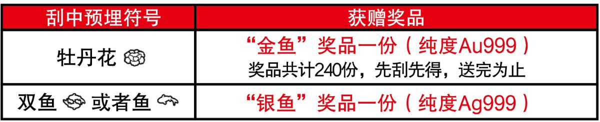 活動期間,彩民在我省任一體彩銷售網(wǎng)點購買30元面值“富貴有余”主題即開票,若單張彩票刮出符合獎勵條件的預埋符號,并經(jīng)兌獎設(shè)備(IVT或BCR等)完成掃描確認(促銷兌獎)且剪角處理后,即可獲贈精美獎品一份,詳見下表: