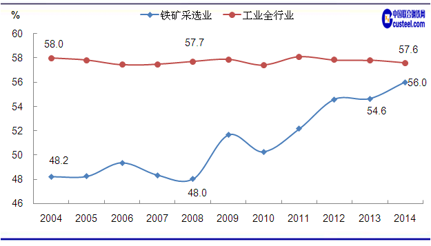 圖4 2004-2014年鐵礦采選業(yè)及工業(yè)全行業(yè)資產(chǎn)負(fù)債率變化走勢 數(shù)據(jù)來源:中國統(tǒng)計局