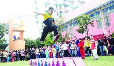 幼兒園男老師縱身一跳,跳過(guò)12個(gè)障礙墊,令在場(chǎng)的孩子們興奮地尖叫。