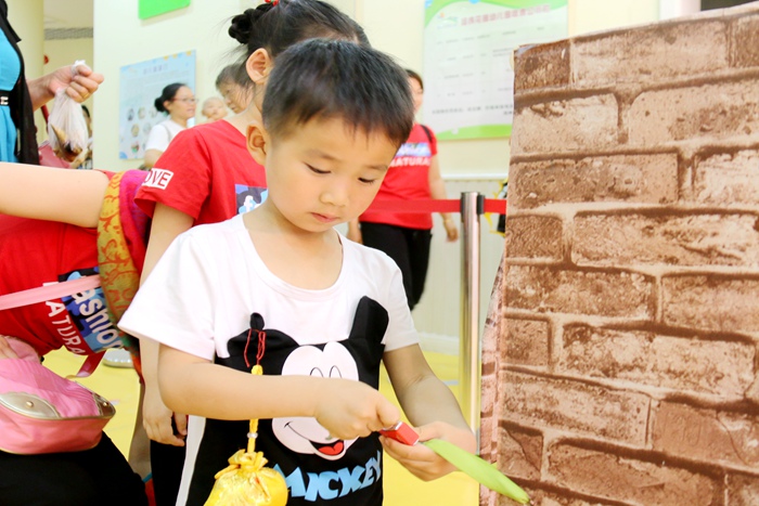 在親子游園活動(dòng)中,各班教師結(jié)合端午民俗設(shè)計(jì)了《賽龍舟》《芝麻開門》《猜謎樂》《沙漠尋寶》等有趣的游戲,每個(gè)家庭積極參與游戲就會(huì)得到小簽章,集齊所有的簽章就會(huì)得到包粽子的機(jī)會(huì),包好兩個(gè)粽子又會(huì)獲得香囊的禮物。在一個(gè)接一個(gè)扣人心弦的游戲中,孩子們學(xué)會(huì)了敢于嘗試、勇于挑戰(zhàn);在濃濃的節(jié)日氣氛里,孩子們獲得了快樂、自信與成長。