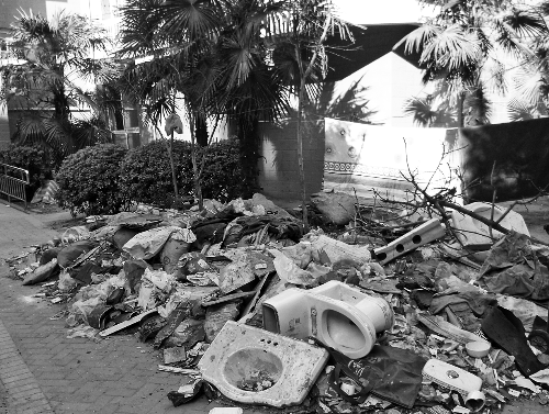 小區(qū)14號(hào)樓前樓梯口垃圾成堆:裝修廢渣、木板、鋼材塞滿垃圾桶,其中夾雜著各色生活垃圾,幾個(gè)廢棄的馬桶泛著扎眼的白光,還沒(méi)走近一股惡臭就撲面而來(lái)……