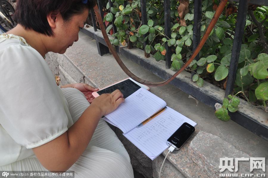 傘下,一名拿著平板電腦蹲在地上的女士在幫李俊強(qiáng)進(jìn)行微信募捐。這名愛心人士叫左微,是一集團(tuán)公司的負(fù)責(zé)人,21日看到東方今報(bào)“賣水爸爸”的報(bào)道后,她在微信群里發(fā)起“一瓶水”公益,22日募集3200元,23日上午募集5600多元。
